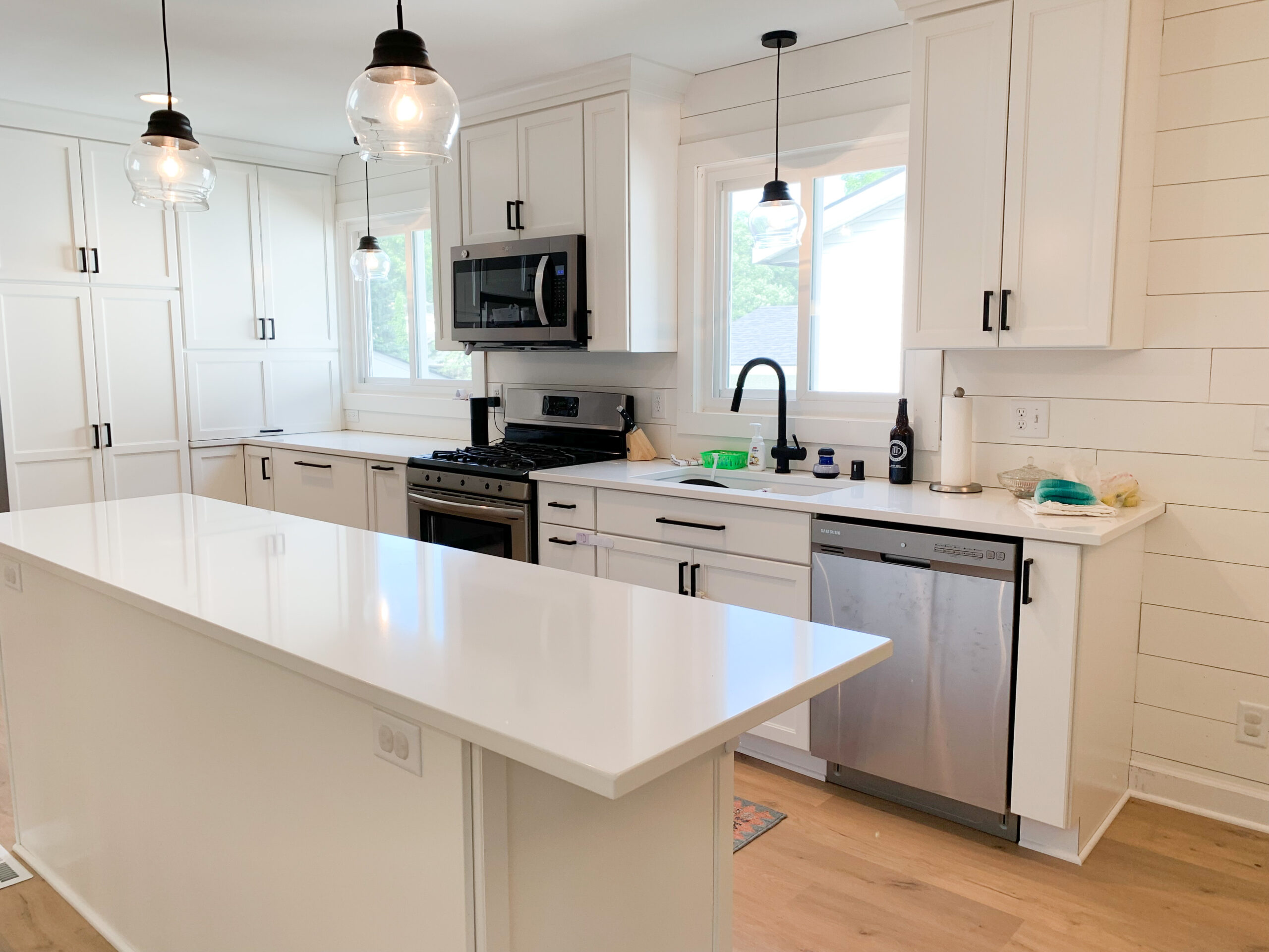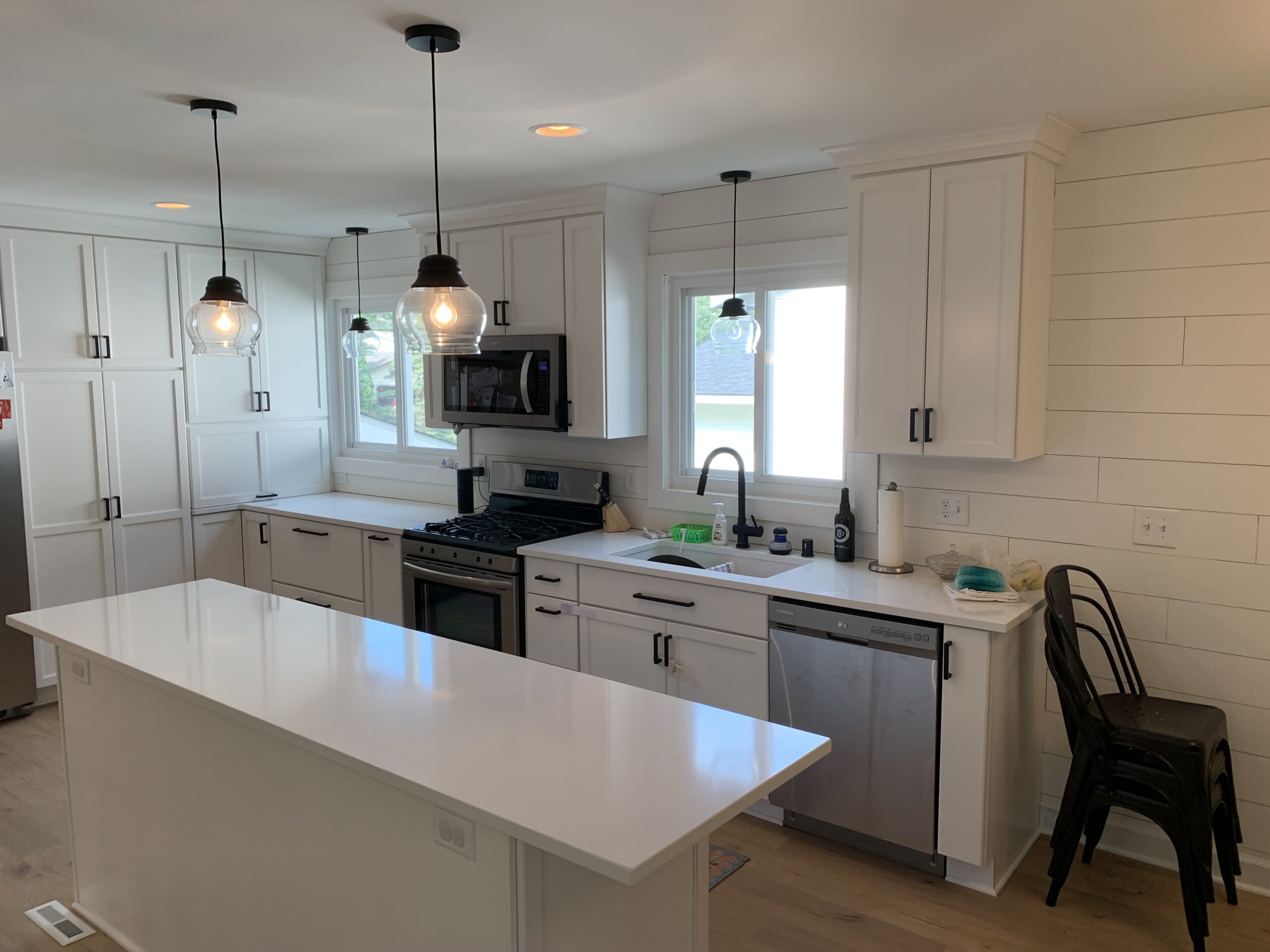 The stylish pendant glass bulbs and a distinctive quartz countertop add a touch of sophistication. To address storage concerns, we incorporated a full-wall pantry and an appliance garage, ensuring that functionality meets beauty in this stunning renovation.