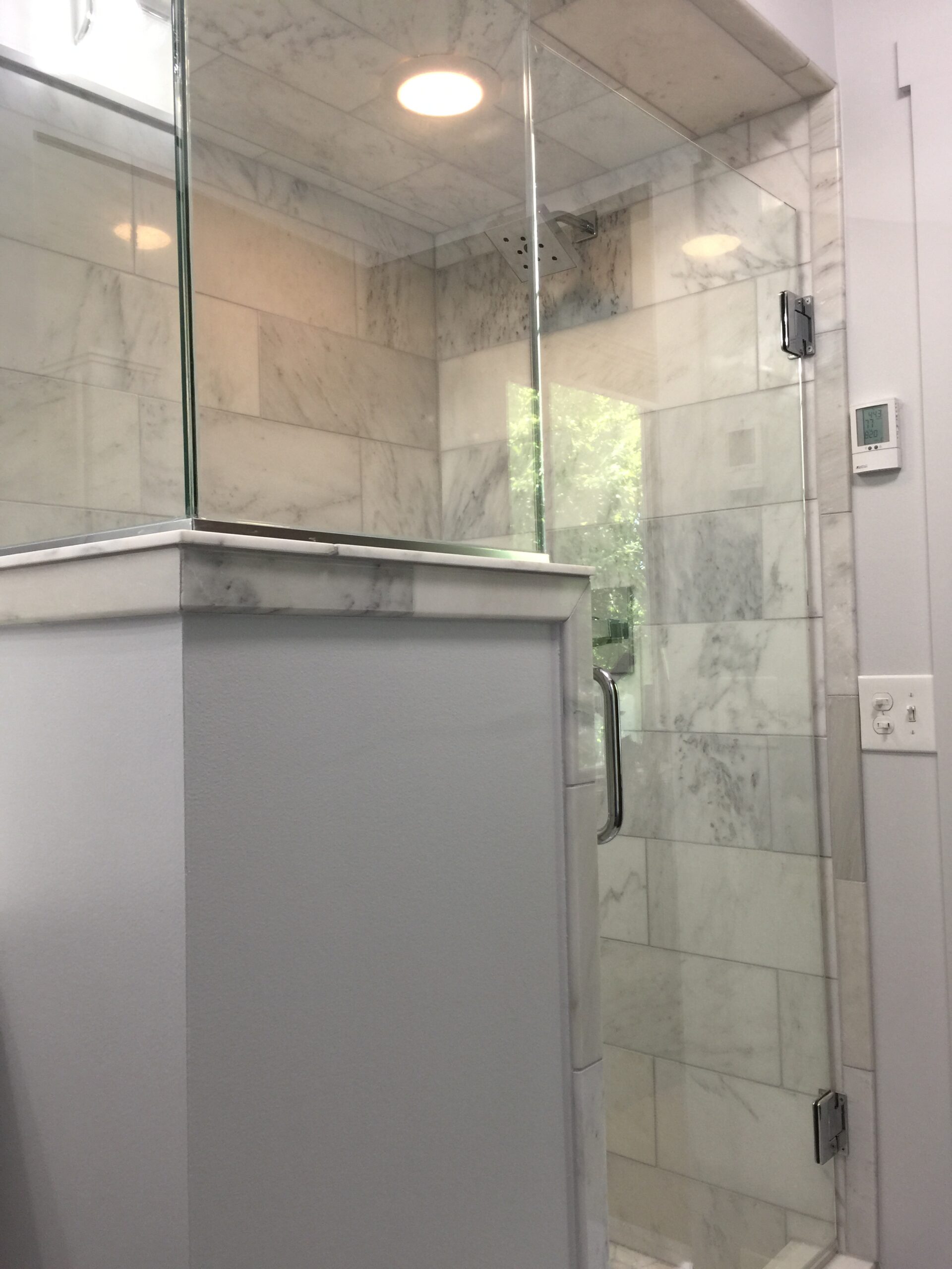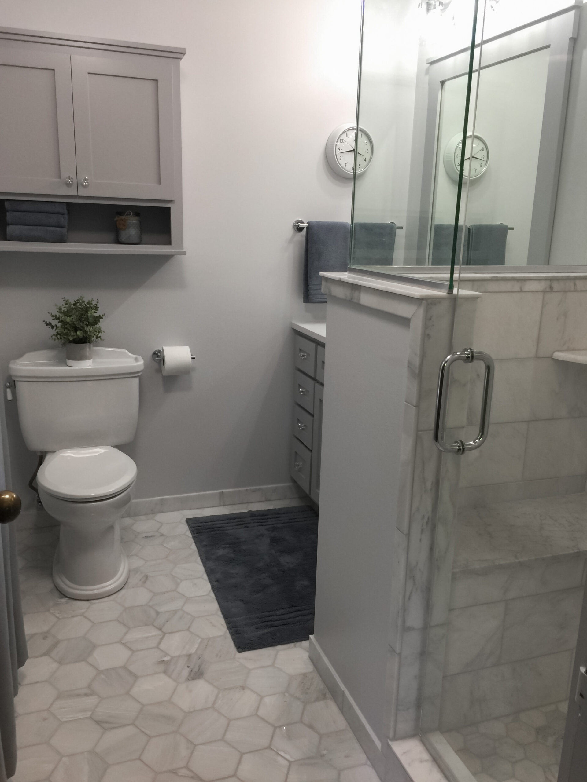 The space now boasts a custom glass shower and door, complemented by a luxurious marble tile floor and ceiling, with a new marble bench for added sophistication. We upgraded to color-chrome finishes and included heated floors for a touch of warmth. The vanity features a sleek quartz countertop, and a new Toto toilet adds modern functionality. Additional updates include a custom mirror, a new door frame with self-closing hinges, and smooth drawer slides. The result is a stylish and functional bathroom tailored to the customer’s exacting standards.