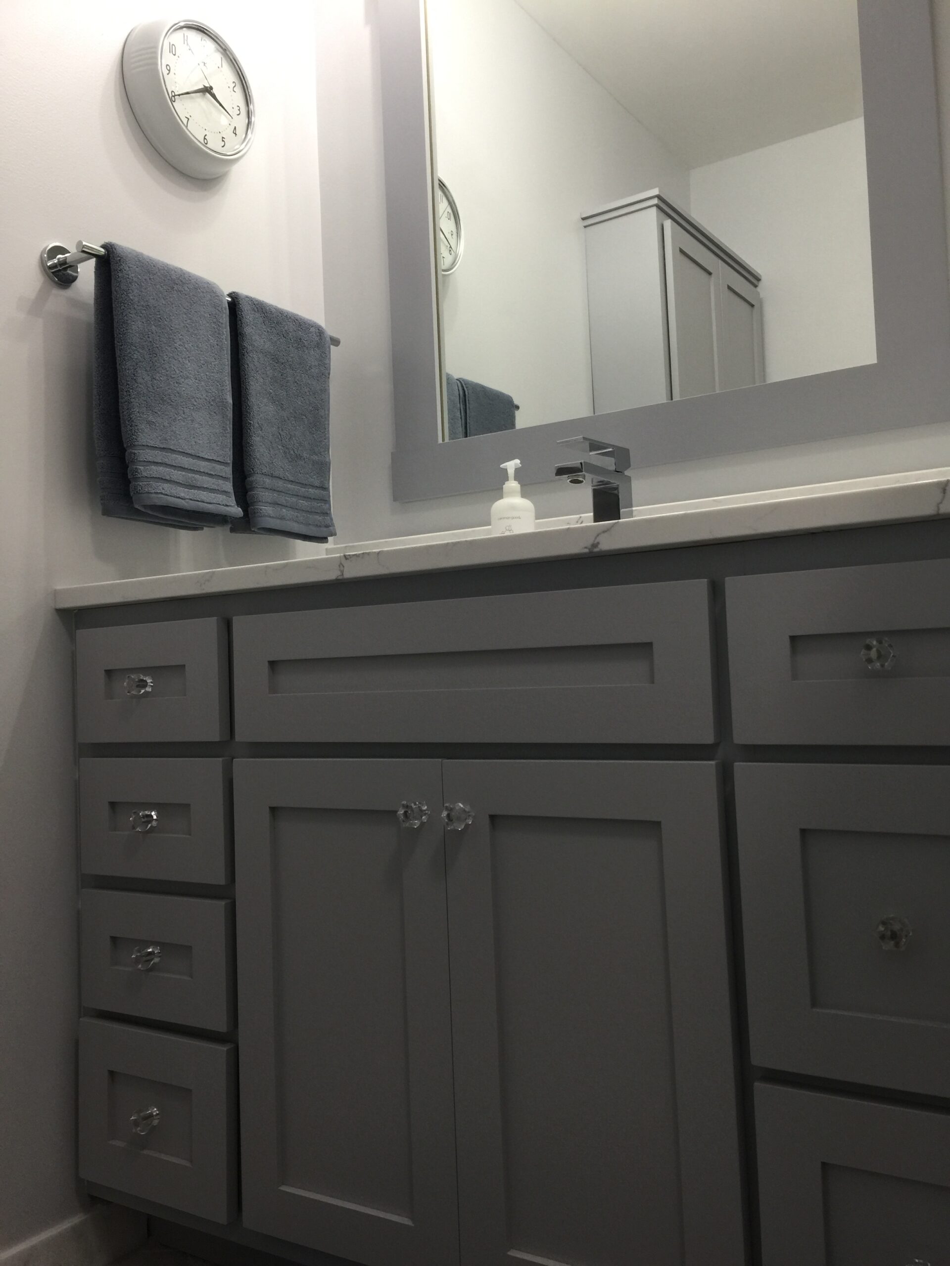 We transformed a dated bathroom with a full demo that addressed issues like a rotten shower floor and leaking shower. We upgraded from the old 70s tile and Hollywood-style mirror to a modern, elegant design. The renovation included custom framing a new half-wall and resizing the shower for added space. We installed a fan in the shower and incorporated a custom-built bench. The vanity was meticulously crafted to meet the customer’s storage needs, featuring adjustable shelving in a cabinet above the toilet.