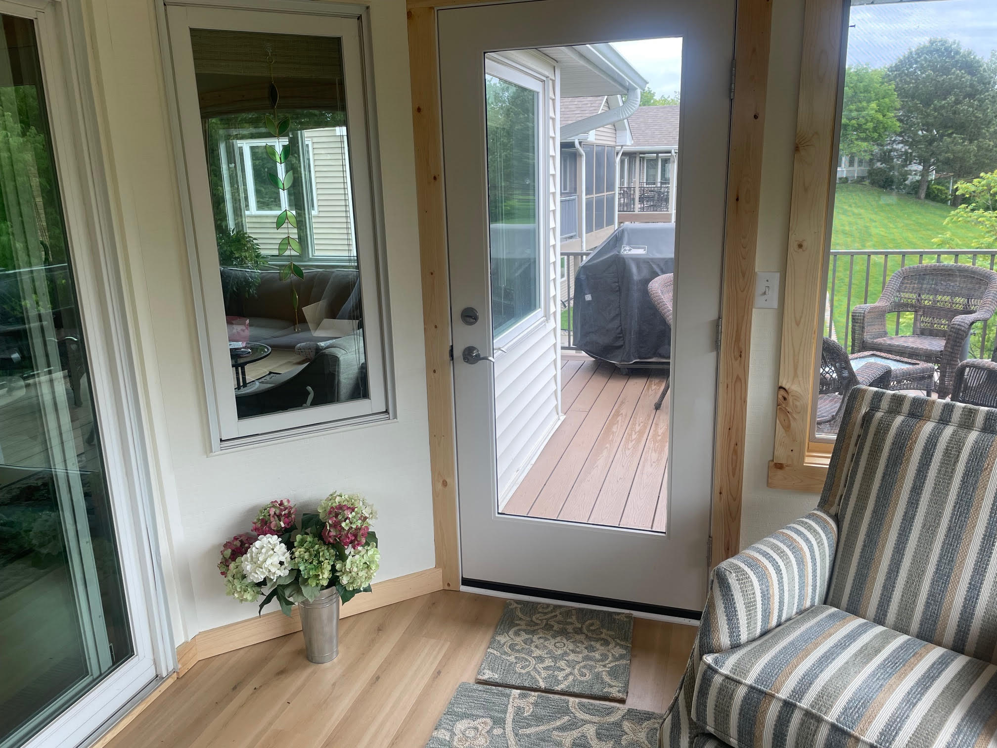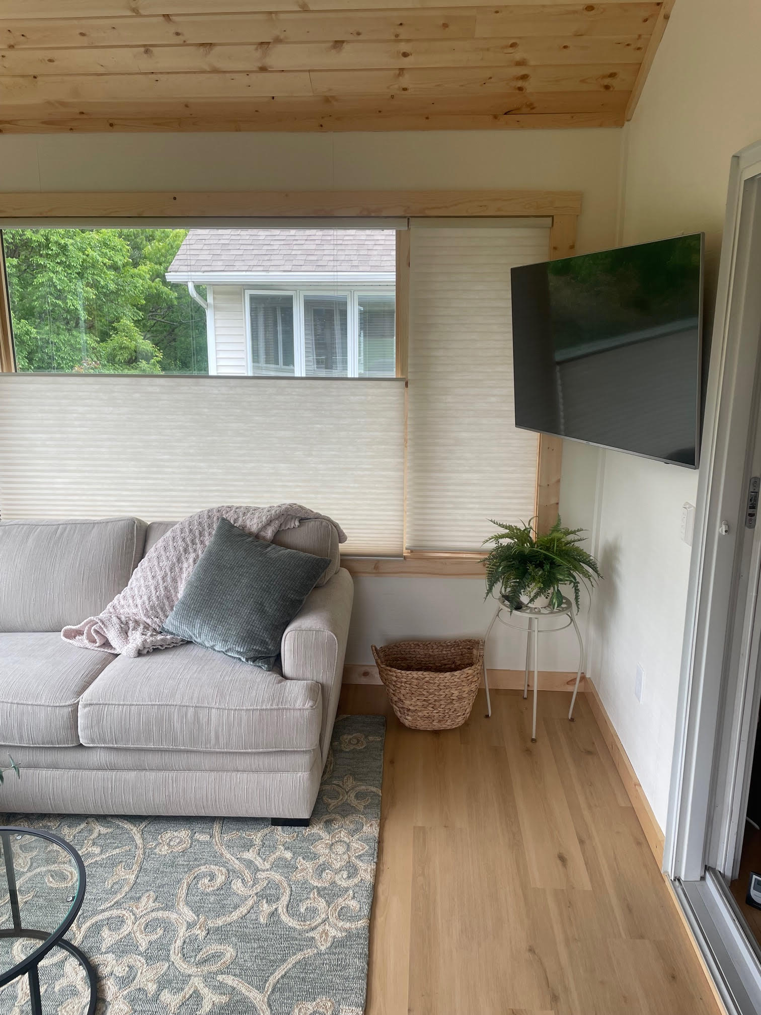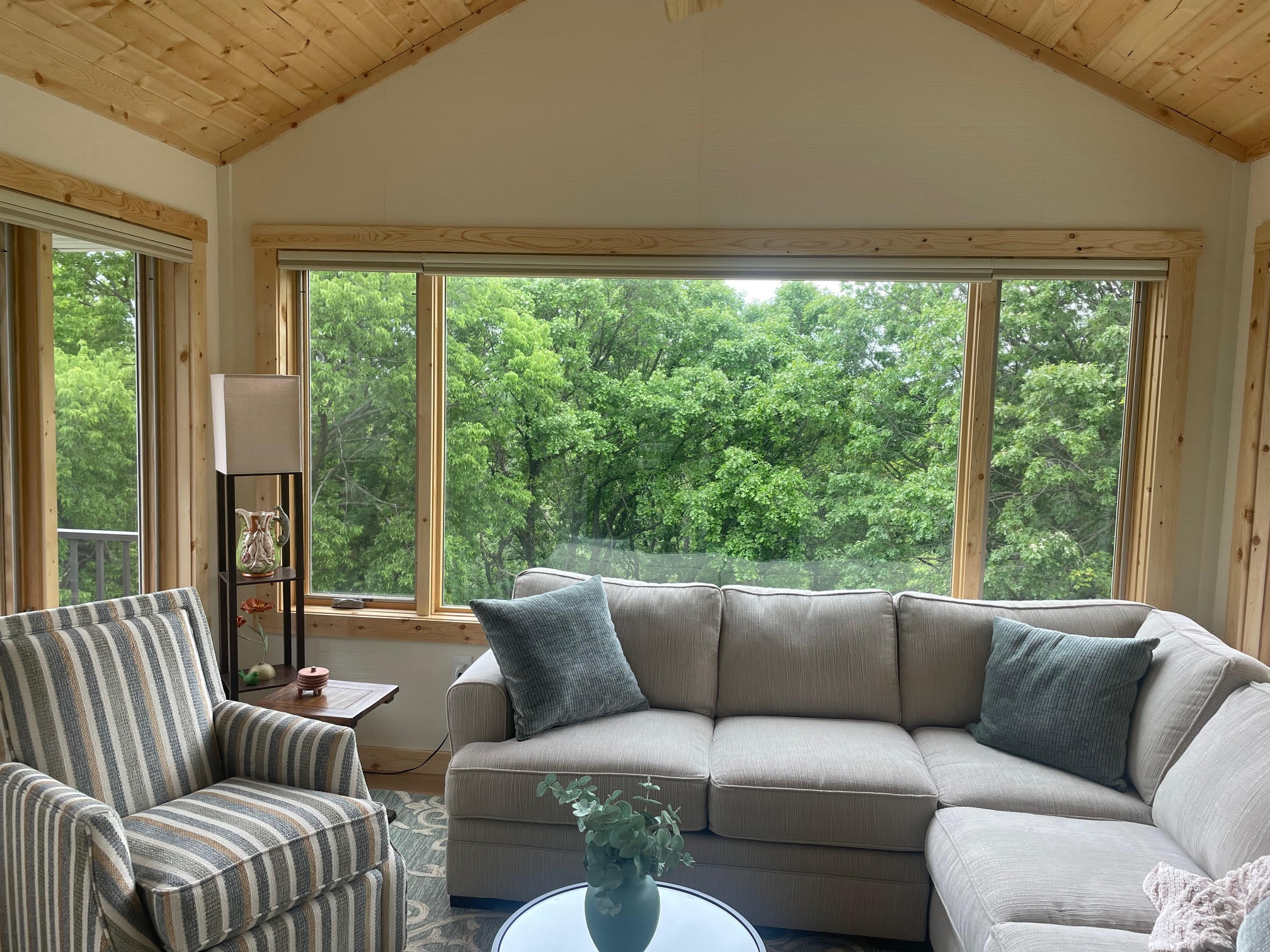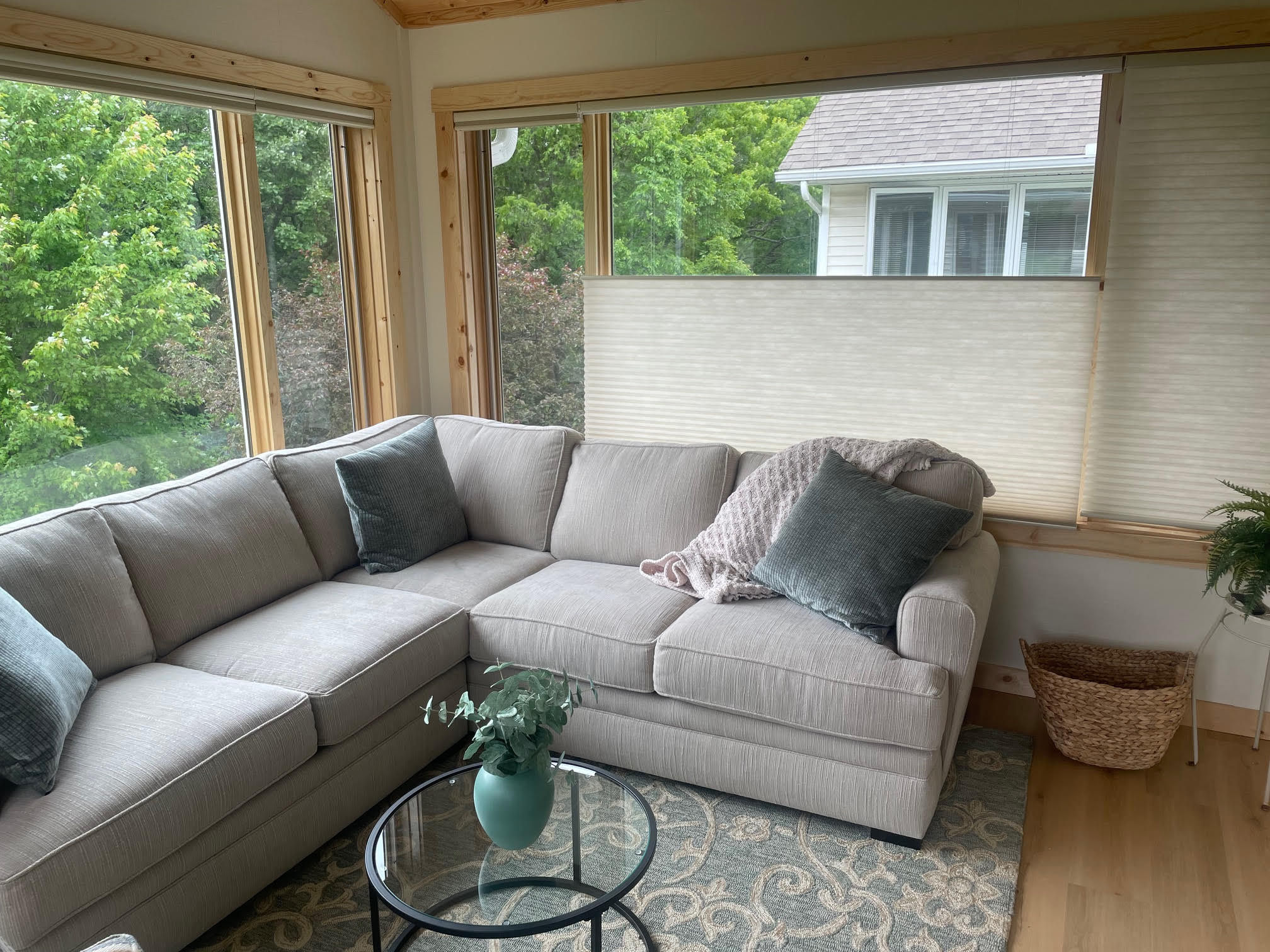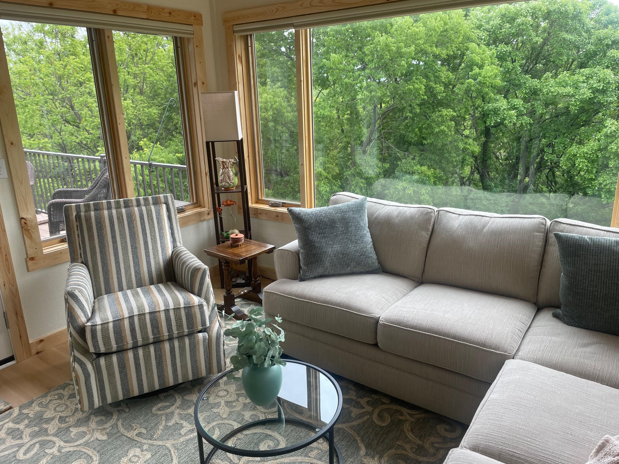 Surrounded by beautiful trees, this contemporary townhouse is filled with light and is perfectly tailored to its residents. This 4-season sunroom addition seamlessly blends style with magnificent views. Every detail of the room has been carefully considered, from the custom Swiss Oak Praline flooring to the wall-to-wall windows and knotty pine ceiling and trim. This new space provides function and relaxation and a place for gathering with the grandchildren or a coffee corner for tranquil mornings. The finishing touches in this home add warmth and coziness and complement its outdoor views.