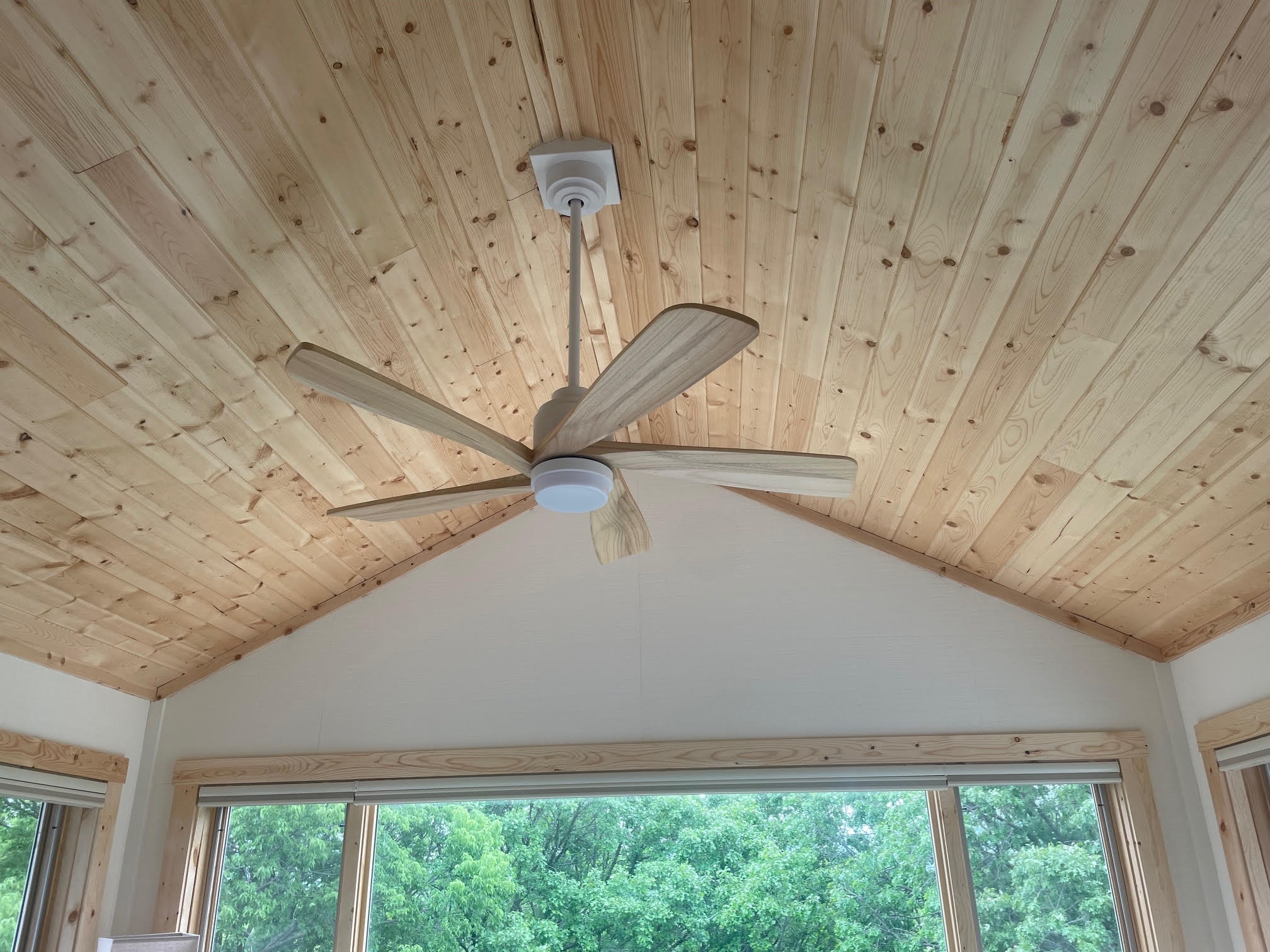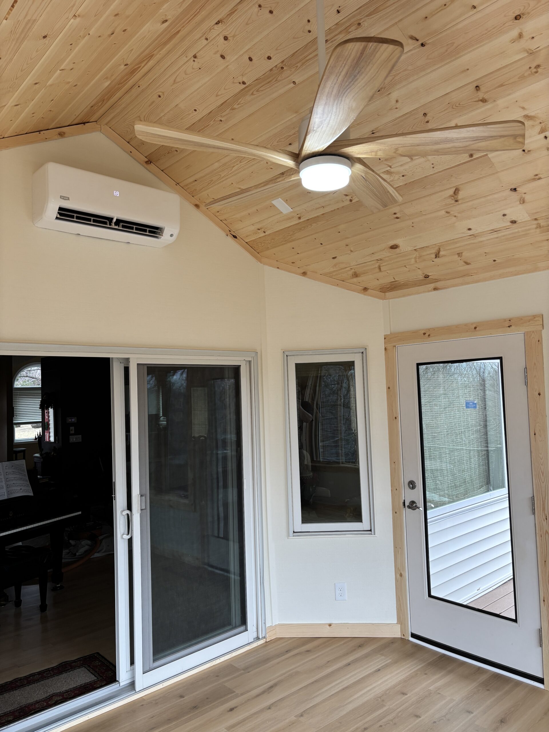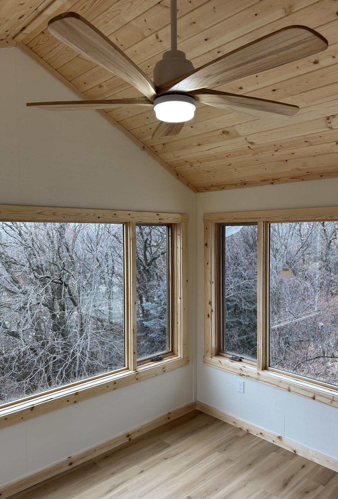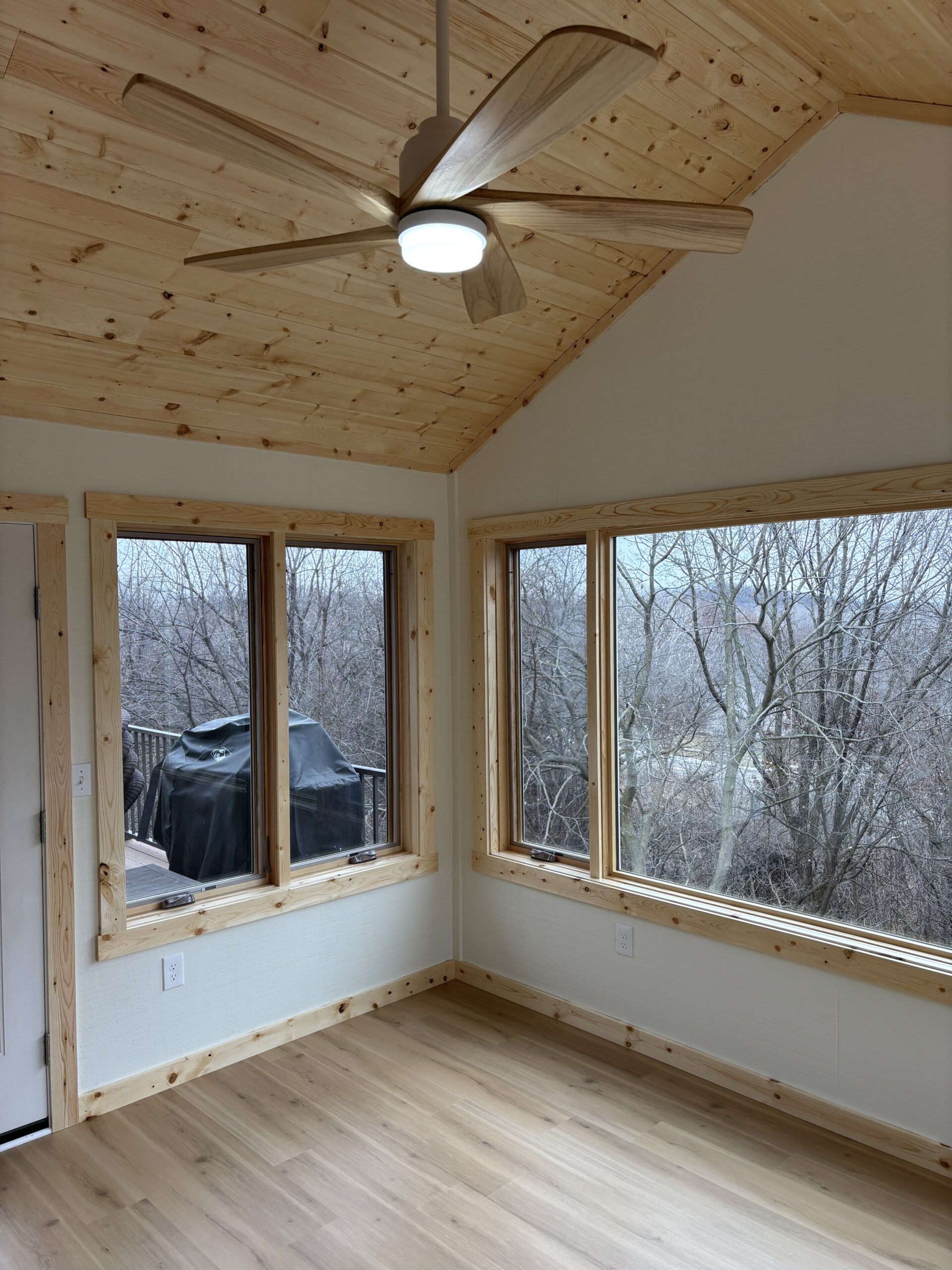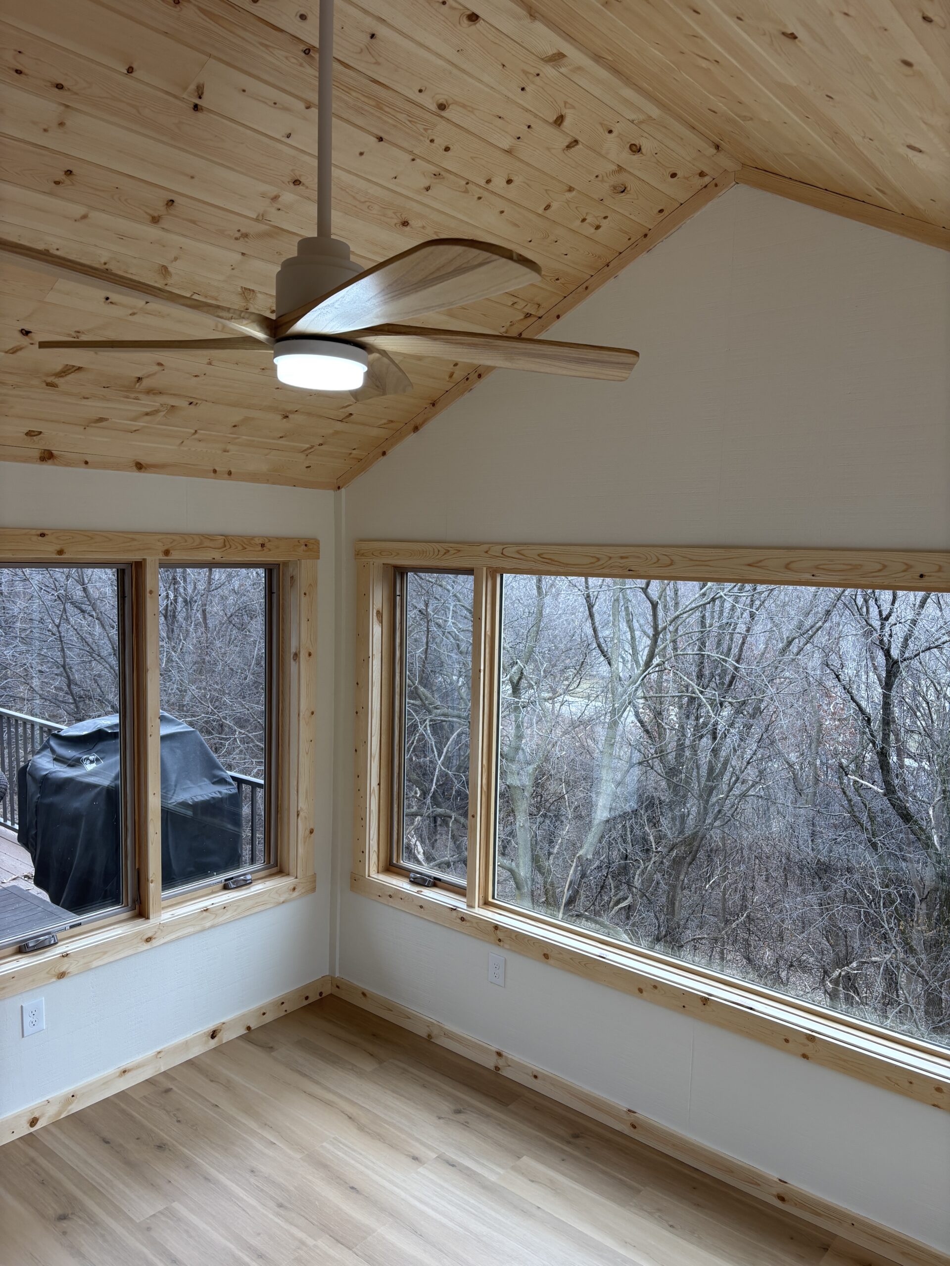 Surrounded by beautiful trees, this contemporary townhouse is filled with light and is perfectly tailored to its residents. This 4-season sunroom addition seamlessly blends style with magnificent views. Every detail of the room has been carefully considered, from the custom Swiss Oak Praline flooring to the wall-to-wall windows and knotty pine ceiling and trim. This new space provides function and relaxation and a place for gathering with the grandchildren or a coffee corner for tranquil mornings. The finishing touches in this home add warmth and coziness and complement its outdoor views.